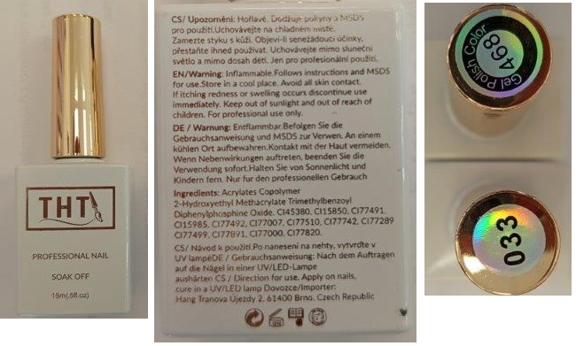 | 2026 / 57. | 2026 / 57. THT, PROFESSIONAL NAIL SOAK OFF, 15 ml, 362, 376, 033, 468 (Gel Polish Color) - foto č.1 Nebezpečný výrobek 18.03.2026 |